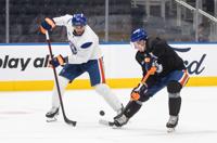 Edmonton Oilers' Leon Draisaitl (29) and Connor McDavid (97) take part in practice before Game 1 of the Stanley Cup final against the Florida Panthers, in Edmonton on Tuesday, June 3, 2025. THE CANADIAN PRESS/Jason Franson