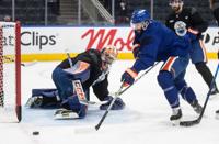 Edmonton Oilers goalie Stuart Skinner (74) makes a save on Adam Henrique (19) during practice before Game 1 of the Stanley Cup final against the Florida Panthers, in Edmonton on Tuesday, June 3, 2025. THE CANADIAN PRESS/Jason Franson