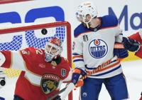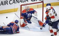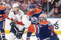 Florida Panthers' Eetu Luostarinen (27) looks on as Edmonton Oilers' Philip Broberg (86) and goalie Stuart Skinner (74) block the net during the first period of Game 6 of the NHL hockey Stanley Cup final in Edmonton, Friday, June 21, 2024. THE CANADIAN PRESS/Jeff McIntosh
