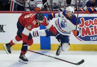 Florida Panthers left wing Matthew Tkachuk (19) attempts to stop a goal by Edmonton Oilers center Connor McDavid (97) during the third period of Game 5 of the NHL hockey Stanley Cup Finals, Tuesday, June 18, 2024, in Sunrise, Fla. The Oilers defeated the Panthers 5-3. (AP Photo/Rebecca Blackwell)