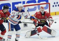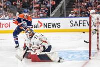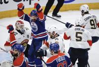 Edmonton Oilers left wing Zach Hyman (18) watches as a shot by center Connor McDavid enters the net for a goal against Florida Panthers goaltender Sergei Bobrovsky (72) during the second period of Game 5 of the NHL hockey Stanley Cup Finals, Tuesday, June 18, 2024, in Sunrise, Fla. (AP Photo/Rebecca Blackwell)