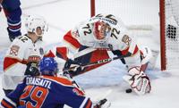 Florida Panthers goaltender Sergei Bobrovsky (72) makes a save on a tip by Edmonton Oilers forward Ryan Nugent-Hopkins (93) during second period game 2 action of the NHL Stanley Cup finals in Sunrise, Fla., on Monday, June 10, 2024. THE CANADIAN PRESS/Nathan Denette