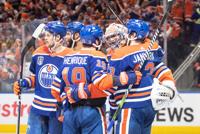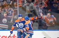 Edmonton Oilers' Zach Hyman (18) celebrates his goal with teammate Ryan Nugent-Hopkins (93) as Florida Panthers' Gustav Forsling (42) looks on during the second period of Game 6 of the NHL hockey Stanley Cup final in Edmonton, Friday, June 21, 2024.THE CANADIAN PRESS/Jeff McIntosh