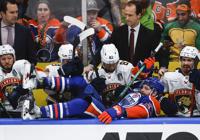 Florida Panthers' Kevin Stenlund (82) helps Edmonton Oilers' Warren Foegele (37) off their bench after he was checked into it during the third period of Game 3 of the NHL hockey Stanley Cup final in Edmonton, Thursday, June 13, 2024. THE CANADIAN PRESS/Jeff McIntosh