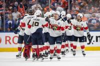Florida Panthers' Vladimir Tarasenko (10) celebrates his goal with teammate Eetu Luostarinen (27) as Edmonton Oilers' Cody Ceci (5) reacts during the second period of Game 3 of the NHL hockey Stanley Cup final in Edmonton, Thursday, June 13, 2024. THE CANADIAN PRESS/Jeff McIntosh