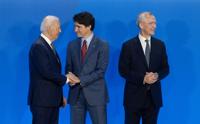 Prime Minister Justin Trudeau shakes hands with United States President Joe Biden and North Atlantic Treaty Organization Secretary General Jens Stoltenberg during an official welcome to the NATO Summit Wednesday, July 10, 2024 in Washington. THE CANADIAN PRESS/Adrian Wyld