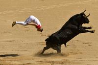 A ''Recortador'' jumps over a bull in the bull ring during the Recortadores festival at the San Fermin fiestas in Pamplona, northern Spain, Sunday, July 7, 2024. (AP Photo/Alvaro Barrientos)