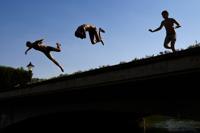 Youngsters jump into a lake in Bucharest, Romania, Tuesday, July 9, 2024 as temperature exceeded 39 degrees Celsius (102.2 Fahrenheit). The national weather forecaster issued an orange warning for the coming week, as temperature is expected to reach 40 degrees Celsius (104 Fahrenheit). (AP Photo/Vadim Ghirda)