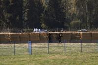 Supporters of the Universal Ostrich Farms in Edgewood, B.C., look out towards a wall of hay bales on Wednesday, Sept. 24, 2025, which were placed by supporters around the perimeter of the farm to block the culling of 400 of the farm’s ostriches. THE CANADIAN PRESS/Aaron Hemens