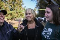 Karen Espersen, centre, the co-owner of Universal Ostrich Farms, speaks with supporters with her daughter, Katie Pasitney, at the farm in Edgewood, B.C., on Monday, Sept. 22, 2025. THE CANADIAN PRESS/Aaron Hemens