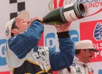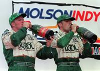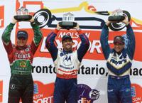 Michael Andretti of the United States, centre, holds up his first place trophy with second place finisher Alex Tagliani of Canada, right, and third place finisher Adrian Fernandez of Mexico, left, on the victory podium at the Molson Indy in Toronto, Sunday, July 15, 2001. The win was Andretti's seventh win in Toronto. THE CANADIAN PRESS/Kevin Frayer