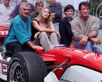 Actors, left to right, Burt Reynolds, Estella Warren, Stacey Edwards and Sylvester Stallone pose on a race car at the Molson Indy in Toronto, on Thursday, July 13, 2000. The actors are in the city to film the movie "Driven" about car racing. THE CANADIAN PRESS/Kevin Frayer