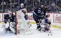 Winnipeg Jets' Logan Stanley (64) defends against Edmonton Oilers' Connor McDavid (97) during first period NHL action in Winnipeg, Thursday, Jan. 8, 2026. THE CANADIAN PRESS/John Woods