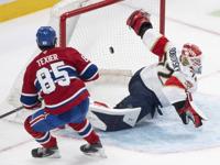 Montreal Canadiens' Alexandre Texier (85) scores on Florida Panthers goaltender Sergei Bobrovsky (72) during third period NHL hockey action in Montreal on Thursday, Jan. 8, 2026. THE CANADIAN PRESS/Christinne Muschi
