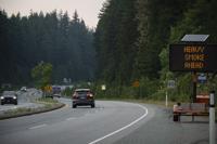 Signage is placed along Highway 99 advising drivers on road conditions caused by the Dryden Creek wildfire, north of Squamish, B.C., on Wednesday, June 11, 2025. THE CANADIAN PRESS/Tijana Martin