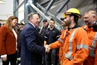 Quebec Premier Francois Legault greets workers at the inauguration of the La Romaine hydroelectric plant, Thursday, October 12, 2023, in Havre Saint-Pierre, Que. THE CANADIAN PRESS/Jacques Boissinot