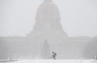 A worker blows snow in front of the Alberta legislature during a heavy snowfall in Edmonton on Wednesday, Dec. 17, 2025. THE CANADIAN PRESS/Jason Franson