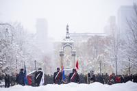Under heavy snowfall, the first of the season, the ceremony began just after 10:30 a.m. There was a 21-gun salute and a flyover by the 438 Tactical Helicopter Squadron, with dignitaries including mayor-elect Soraya Martinez Ferrada and member of Parliament Marc Miller, who is a former infantry commander. More than 100 people attended the ceremony.
