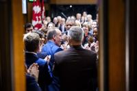 MP Chris d'Entremont, who crossed the floor from the Conservatives to join the Liberals, is applauded by his new colleagues as he arrives at a meeting of the Liberal Caucus on Parliament Hill in Ottawa, on Wednesday, Nov. 5, 2025. THE CANADIAN PRESS/Justin Tang