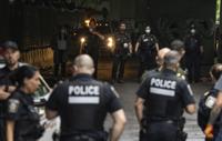 Quebec provincial police officers block an underpass during an eviction of a homeless encampment under the Ville-Marie expressway in Montreal, Tuesday, July 11, 2023. THE CANADIAN PRESS/Christinne Muschi