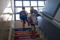 FILE - Students walk up stairs to enter their class during their first day of school at a public elementary school in Drapetsona suburb of Piraeus, near Athens, on Monday, Sept. 12, 2022.(AP Photo/Petros Giannakouris, File)