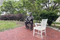 A bronze sculpture of Alfred Kinsey, a sex researcher who founded Indiana University's branch of sex research, the Kinsey Institute, sits outside the institute's research facility, Tuesday, May 16, 2023, in Bloomington, Ind. (AP Photo/Arleigh Rodgers)
