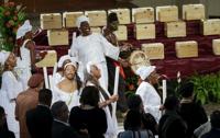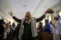 Nana Sula "Janet" Evans blesses the remains of 19 African Americans repatriated from Germany during their memorial service at Dillard University's Lawless Memorial Chapel in New Orleans, Saturday, May 31, 2025. (Scott Threlkeld/The Times-Picayune/The New Orleans Advocate via AP)