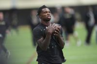 FILE - Penn State defensive lineman Abdul Carter throws during the school's NFL football pro day, Friday, March 28, 2025, in State College, Pa. (AP Photo/Matt Freed,File)