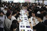 People look at products during the Galaxy Unpacked 2023 event at the COEX in Seoul, South Korea, Wednesday, July 26, 2023. Samsung Electronics on Wednesday unveiled two foldable smartphones as it continues to bet on devices with bending screens, a budding market that has yet to fully take off because of high prices. (AP Photo/Ahn Young-joon)