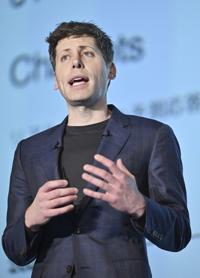 OpenAI Chief Sam Altman delivers a speech during an event for enterprises, with SoftBank Chief Masayoshi Son, in Tokyo, in Tokyo, Monday, Feb. 3, 2025. (Kyodo News via AP)