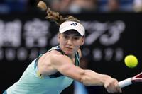 Elena Rybakina of Kazakhstan plays a backhand return to Karolina Pliskova of the Czech Republic during their first round match at the Australian Open tennis championships at Melbourne Park, Melbourne, Australia, Tuesday, Jan. 16, 2024. (AP Photo/Andy Wong)