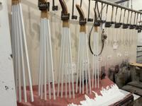At one workstation, a worker uses liquid epoxy to glue fibreglass reinforcing sheets to wooden blades, in batches of six. Nearby, another worker uses a band saw to trim dried excess fibreglass off each blade. In the paint room, sticks are dipped in white paint and then hung on a line of moving hooks to dry.
