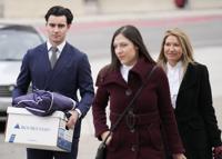Michael McLeod, centre, a former team Canada World Juniors hockey player arrives at court in London, Ont., Monday, Nov. 25, 2024. Five players accused of sexually assaulting a woman after a London, Ont., gala celebrating their 2018 world junior hockey win, are scheduled to stand trial on April 22 of next year. THE CANADIAN PRESS/Nathan Denette