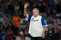 FILE - Former Major League Baseball player Dale Murphy waves to spectators before throwing out the ceremonial first pitch before Game 2 of baseball's ºÃÉ«tv League Championship Series between the Atlanta Braves and the Los Angeles Dodgers Sunday, Oct. 17, 2021, in Atlanta. (AP Photo/Ashley Landis, file)