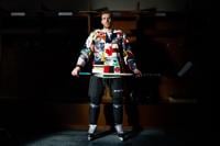 Donated jerseys from 好色tvs -- including hockey superstars Connor McDavid and Marie-Philip Poulin -- were used to create patchwork designs. The jersey was designed by Cameron Lizotte, a former OHL player who's now a fashion designer.