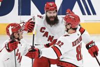 After a slow start, Jaccob Slavin, Brady Skjei and Jesper Fast scored as Carolina (42-12-8) forced overtime in the final frame. Brett Pesce collected two assists.