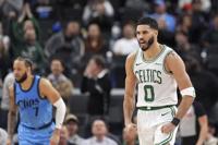 Boston Celtics forward Jayson Tatum, right, celebrates after hitting a three-point shot as Los Angeles Clippers guard Amir Coffey stands by during the second half of an NBA basketball game, Wednesday, Jan. 22, 2025, in Inglewood, Calif. (AP Photo/Mark J. Terrill)