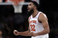 New York Knicks center Karl-Anthony Towns reacts after a basket late in the second half of an NBA basketball game against the Brooklyn Nets, Tuesday, Jan. 21, 2025, in New York. (AP Photo/Adam Hunger)