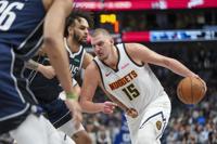 Denver Nuggets center Nikola Jokic (15) drives against Dallas Mavericks center Dereck Lively II during the second half of an NBA basketball game, Sunday, Jan. 12, 2025, in Dallas. The Nuggets won 112-101. (AP Photo/Julio Cortez)
