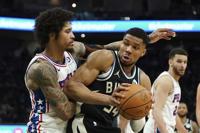 Milwaukee Bucks' Giannis Antetokounmpo, front right, drives to the basket against Philadelphia 76ers' Kelly Oubre Jr., left, during the second half of an NBA basketball game Sunday, Jan. 19, 2025, in Milwaukee. (AP Photo/Aaron Gash)