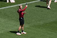 Coach Bev Priestman of Canada takes photos on the pitch at Geoffroy-Guichard Stadium ahead of the 2024 Summer Olympics, Tuesday, July 23, 2024, in Saint-Etienne, France. Canada is scheduled to play New Zealand on Thursday, July 25. The ºÃÉ«tv Olympic Committee says women's soccer assistant coach Jasmine Mander and Canada Soccer analyst Joseph Lombardi have been removed from the ºÃÉ«tv Olympic team and sent home after two drone incidents at the Paris Games. THE CANADIAN PRESS/AP/Silvia Izquierdo