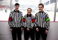 Hockey referees Dylan McMullen (left to right), Dianne Ikeda, Chase Aalders are shown in a handout photo in Cole Harbour, N.S. McMullen and Aalders, who are both under the age of 18, wear a green armband when they officiate hockey games. Minor hockey associations in Nova Scotia are the latest to embrace a program aimed at eliminating verbal abuse of young referees by identifying them on ice with a green armband. THE CANADIAN PRESS/HO-Tim Coombs **MANDATORY CREDIT**