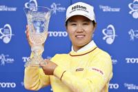 Japan's Nasa Hataoka holds the trophy after winning the LPGA's Toto Japan Classic in Otsu, Shiga prefecture, Japan Sunday, Nov. 9, 2025. (Kyodo News via AP)