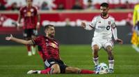 Ottawa Rapid's Delaney Baie Pridham, left, tries to get the ball past Calgary Wild's Meikayla Moore during second half Northern Super League soccer action in the in Calgary, on Sunday, May 11, 2025.THE CANADIAN PRESS/Jeff McIntosh