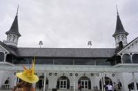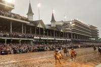 , with the Churchill Downs dirt strip listed as sloppy and fans protecting their fancy hats and clothing with clear plastic ponchos.