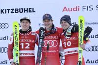 Switzerland's Marco Odermatt, center, winner of an alpine ski, men's World Cup Super-G, celebrates on the podium with second-placed Austria's Ricarda Haaser, left, and third-placed Switzerland's Stefan Rogentin, in Kitzbuehel, Austria, Friday, Jan. 24, 2025. (AP Photo/Marco Trovati)