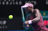 Victoria Mboko of Canada plays a forehand return to Aryna Sabalenka of Belarus during their fourth round match at the Australian Open tennis championship in Melbourne, Australia, Sunday, Jan. 25, 2026. (AP Photo/Dita Alangkara)