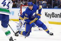 Buffalo Sabres centre Tage Thompson (72) goes down to block a shot during the second period of an NHL hockey game against the Vancouver Canucks Tuesday, Jan. 6, 2026, in Buffalo, N.Y. (AP Photo/Jeffrey T. Barnes)