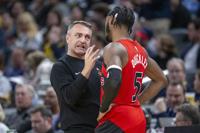 Toronto Raptors head coach Darko Rajaković talks with guard Immanuel Quickley (5) during a break in the first half of an NBA basketball game in Indianapolis, Wednesday, Feb. 26, 2025. (AP Photo/Doug McSchooler)