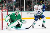 Vancouver Canucks right-winger Brock Boeser (6) attempts to control a shot against Dallas Stars goaltender Casey Desmith in the second period of an NHL hockey game Thursday, Oct. 16, 2025, in Dallas. (AP Photo/Tony Gutierrez)